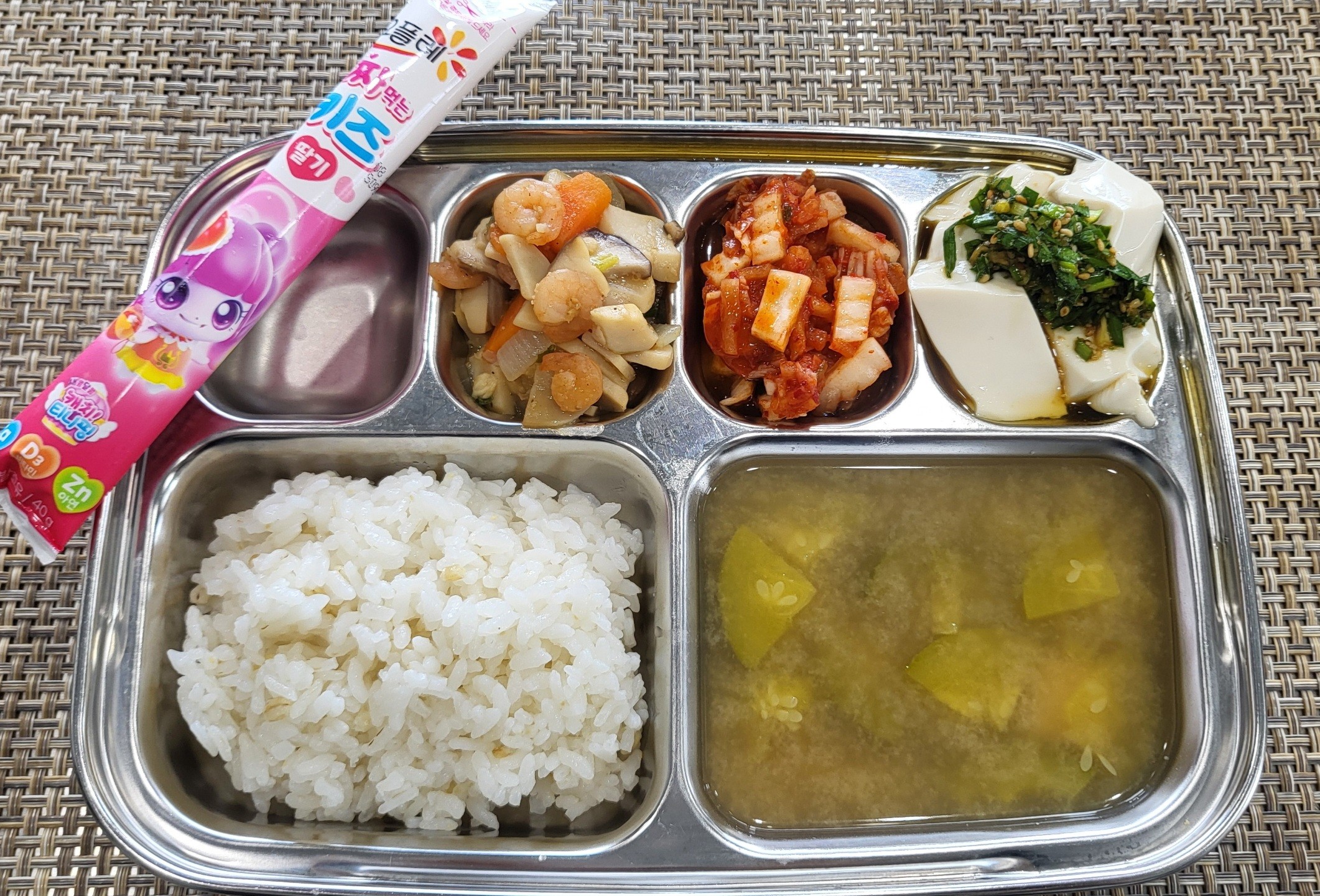 점 심 ~ 보리쌀밥, 호박두부된장국, 새우살버섯볶음, 연두부*양념장, 짜요짜요(딸기), 배추김치