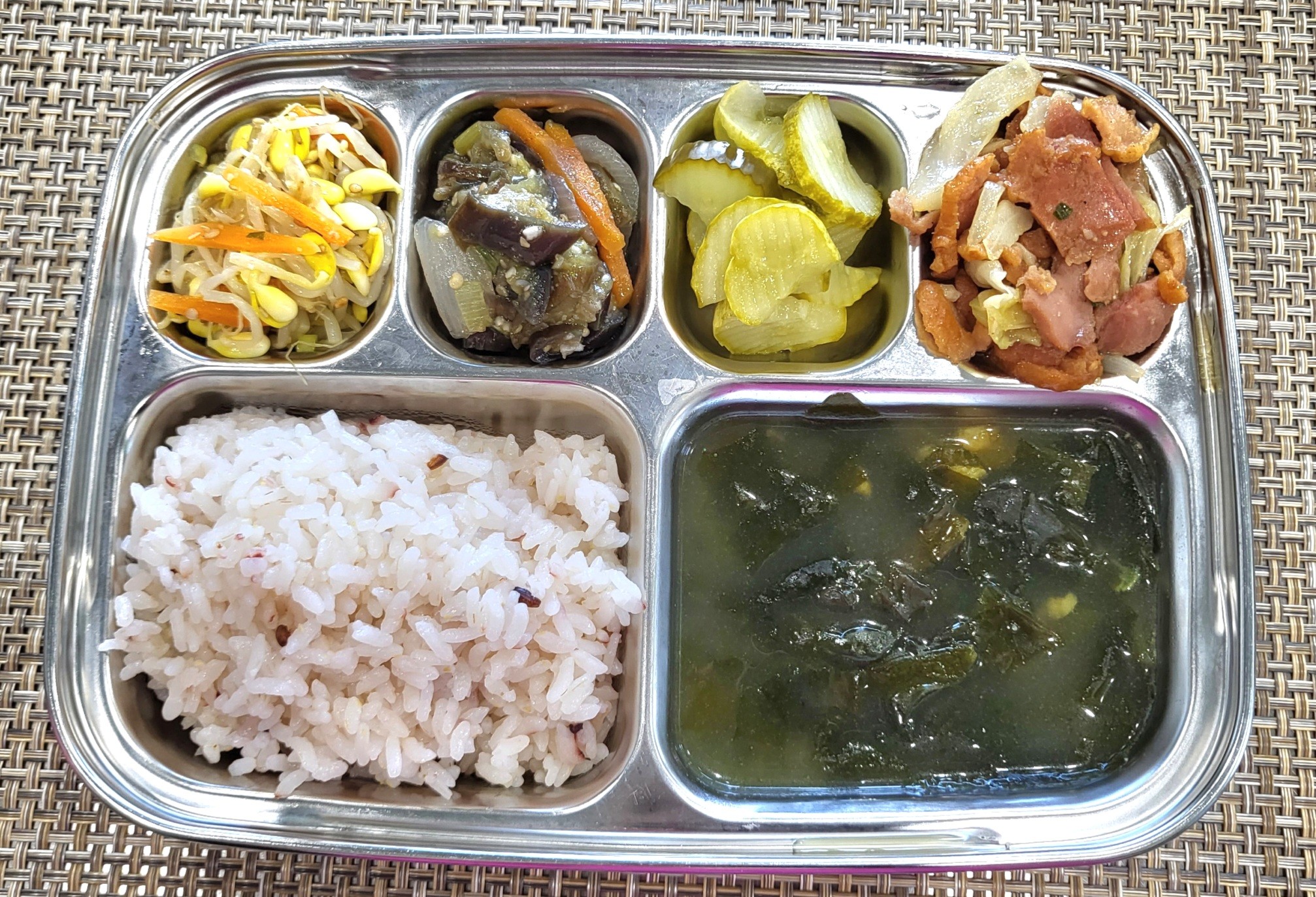 점 심 ~ 흑미밥, 황태미역국, 훈제오리구이, 콩나물무침, 가지볶음, 오이피클
