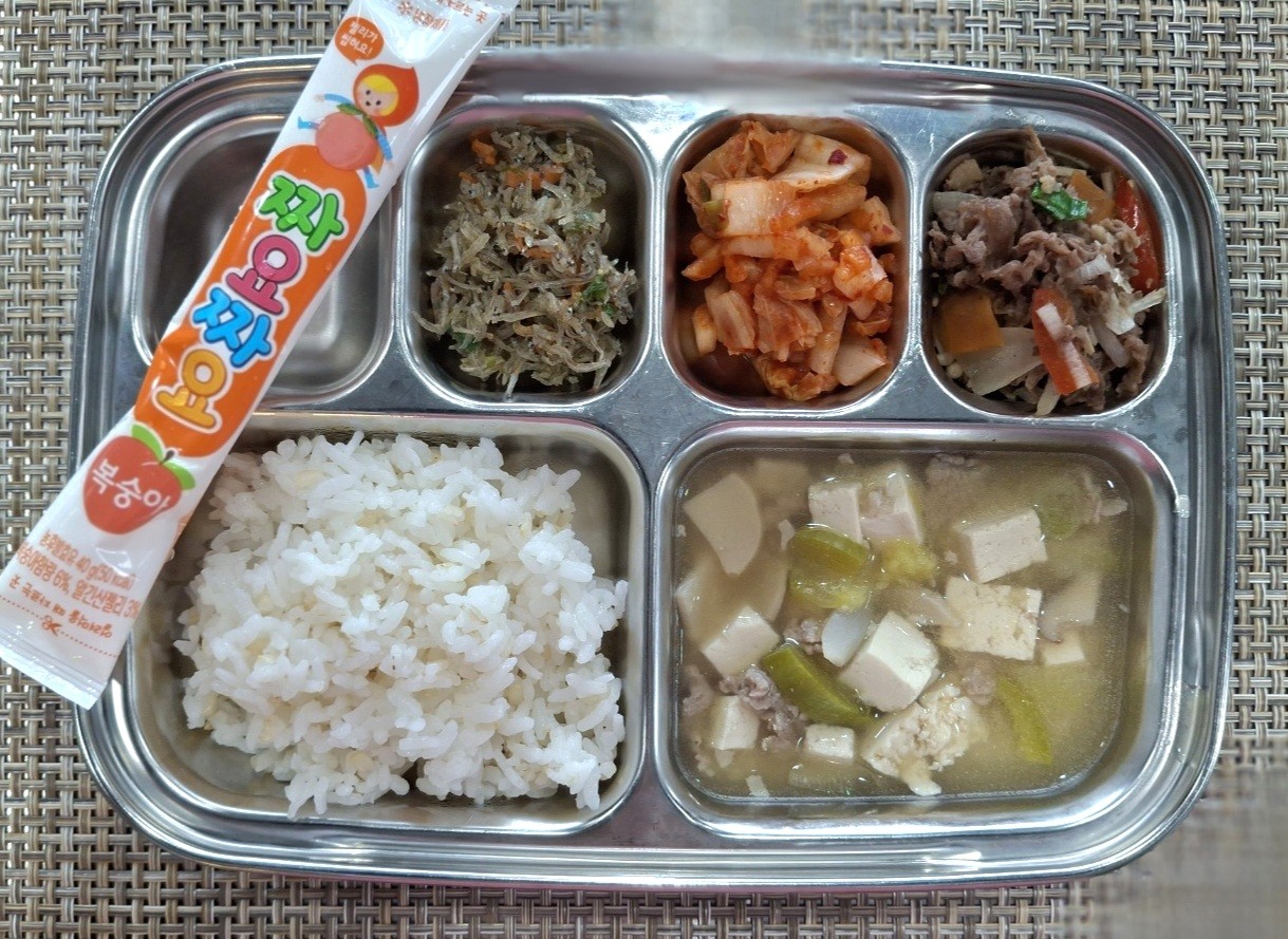 점 심~ 현미찹쌀밥, 청국장, 팽이버섯소불고기, 잔멸치볶음, 배추김치, 짜요짜요(복숭아)