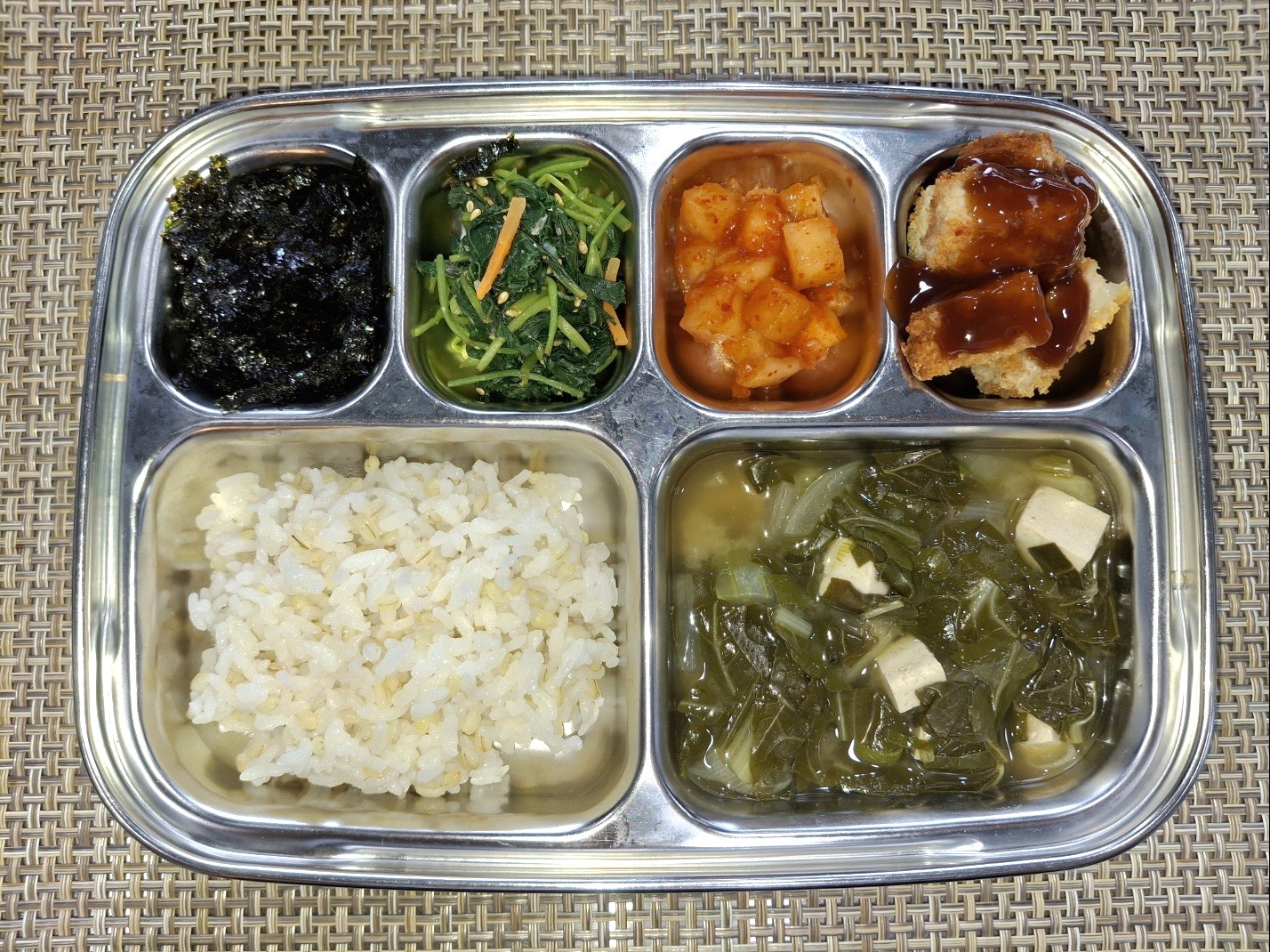 점 심 ~ 보리밥, 근대두부된장국, 순살돈까스*소스, 참나물무침, 조미김, 홍시깍두기