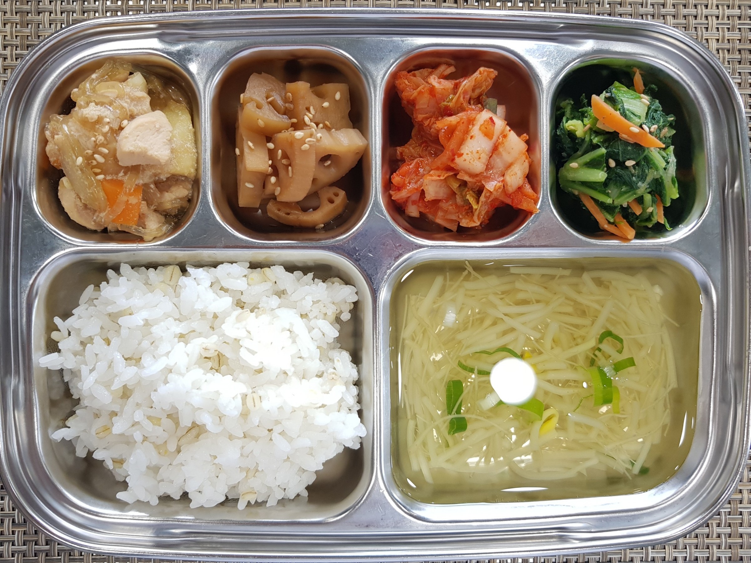 점 심 ~ 찰보리밥, 콩나물국, 안동찜닭, 얼갈이된장무침, 연근조림, 배추김치