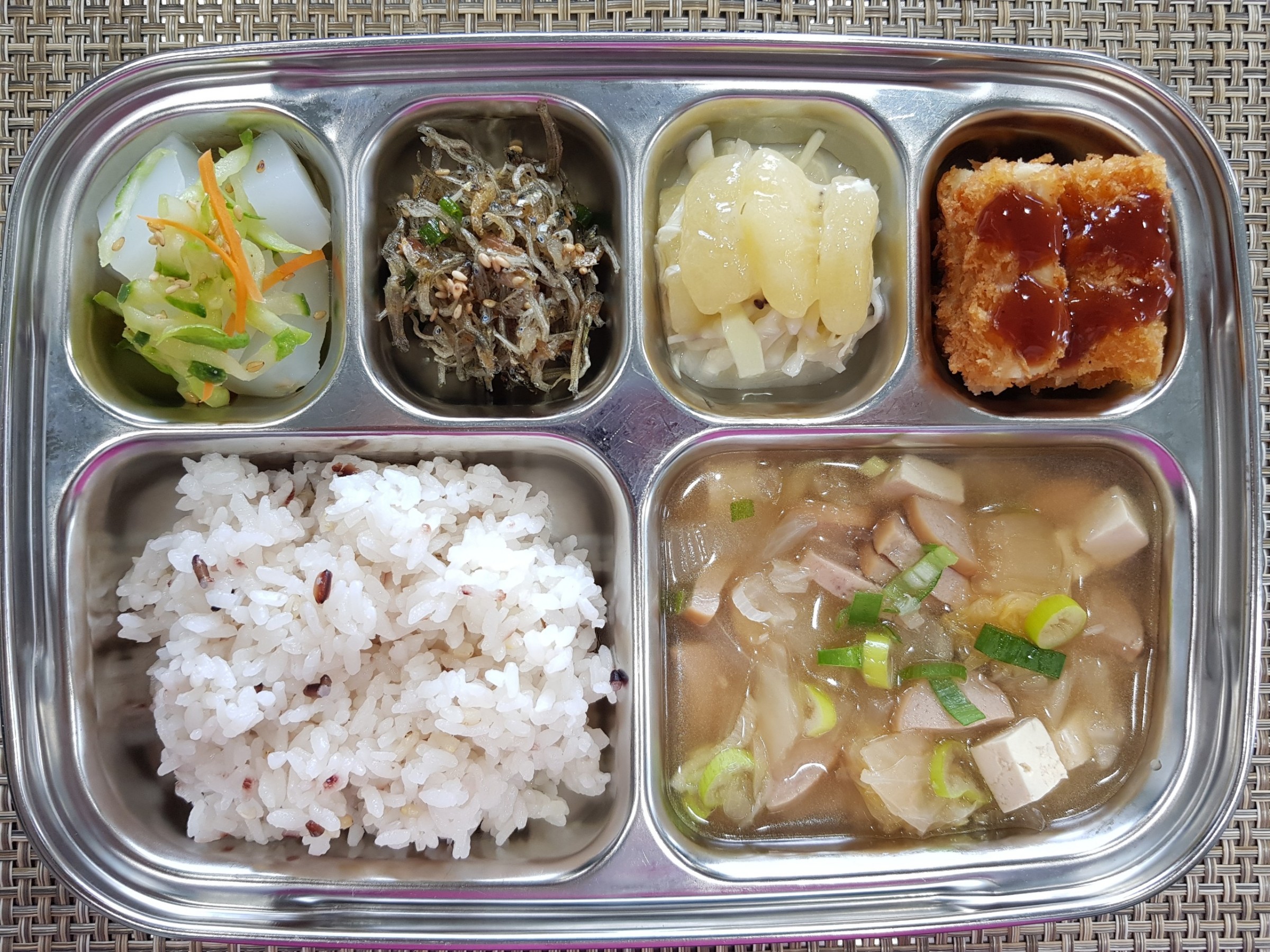 점 심 ~ 흑미밥, 부대찌개, 순살치킨까스*소스, 청포묵무침, 잔멸치볶음, 양배추키위샐러드