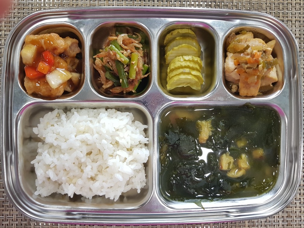 점 심 ~ 보리쌀밥, 황태미역국, 탕수육*소스, 마늘쫑건새우볶음,, 두부양념조림, 오이피클