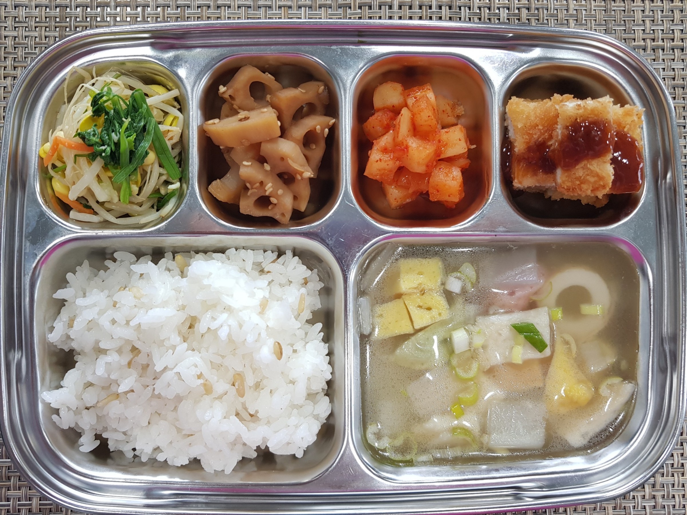 점 심 ~ 귀리밥, 모듬어묵국, 순살치킨가스*소스, 연근조림, 미나리콩나물무침, 홍시깍두기