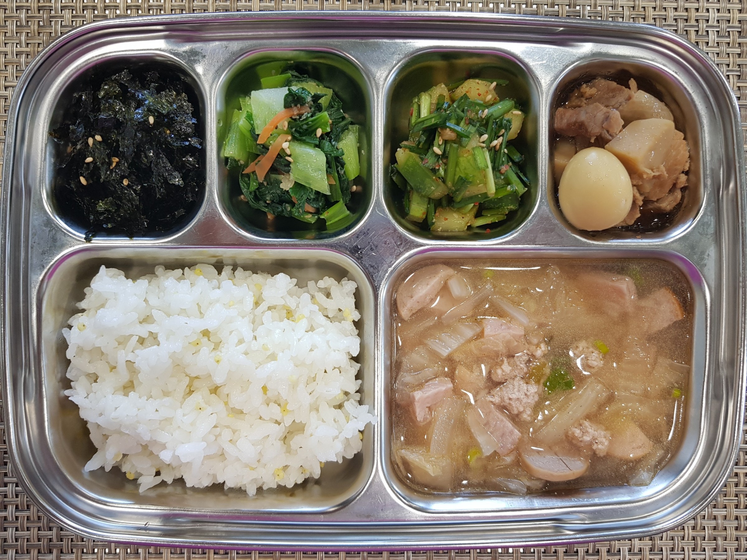 점 심 ~ 기장밥, 부대찌개, 메추리알돈육장조림, 청경채무침, 조미김, 오이부추김치