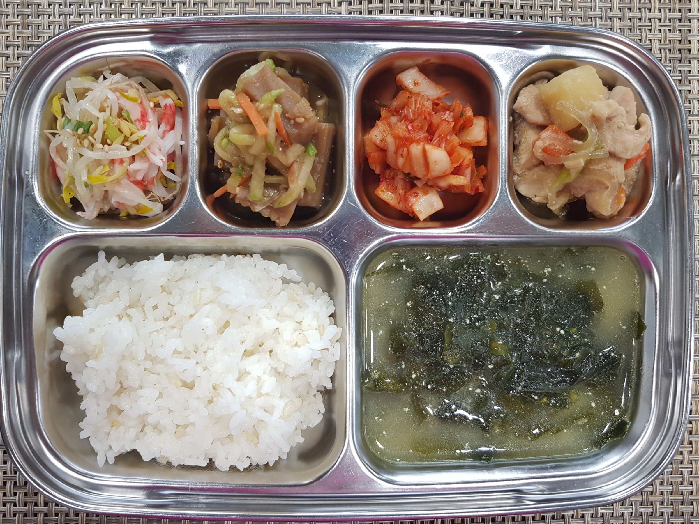 점 심 ~ 현미밥, 들깨미역국, 안동찜닭, 크래미숙주나물, 도토리묵무침, 배추김치