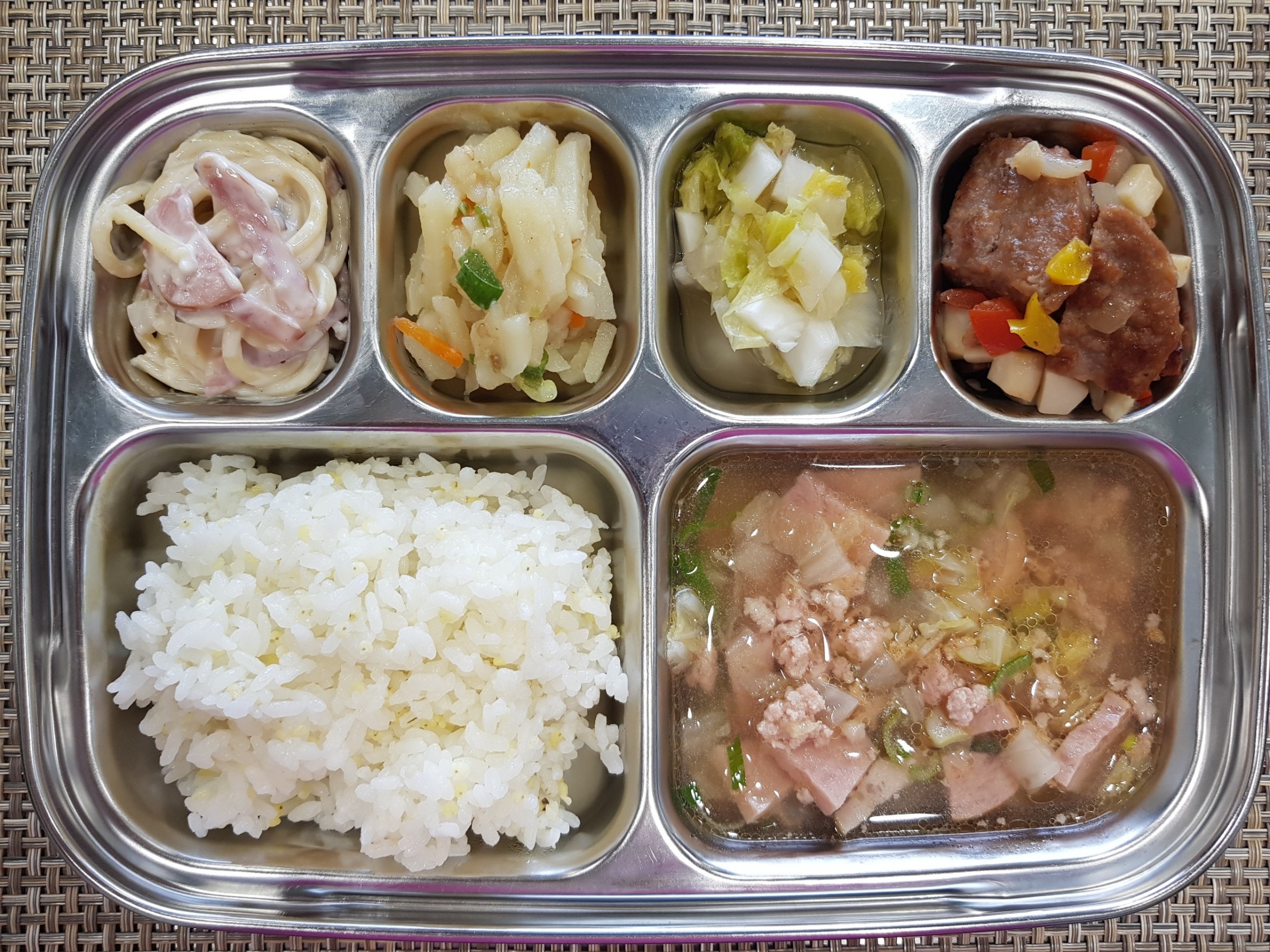 점 심 ~ 기장밥, 부대찌개, 새송이떡갈비구이, 감자채볶음, 크림스파게티, 백김치