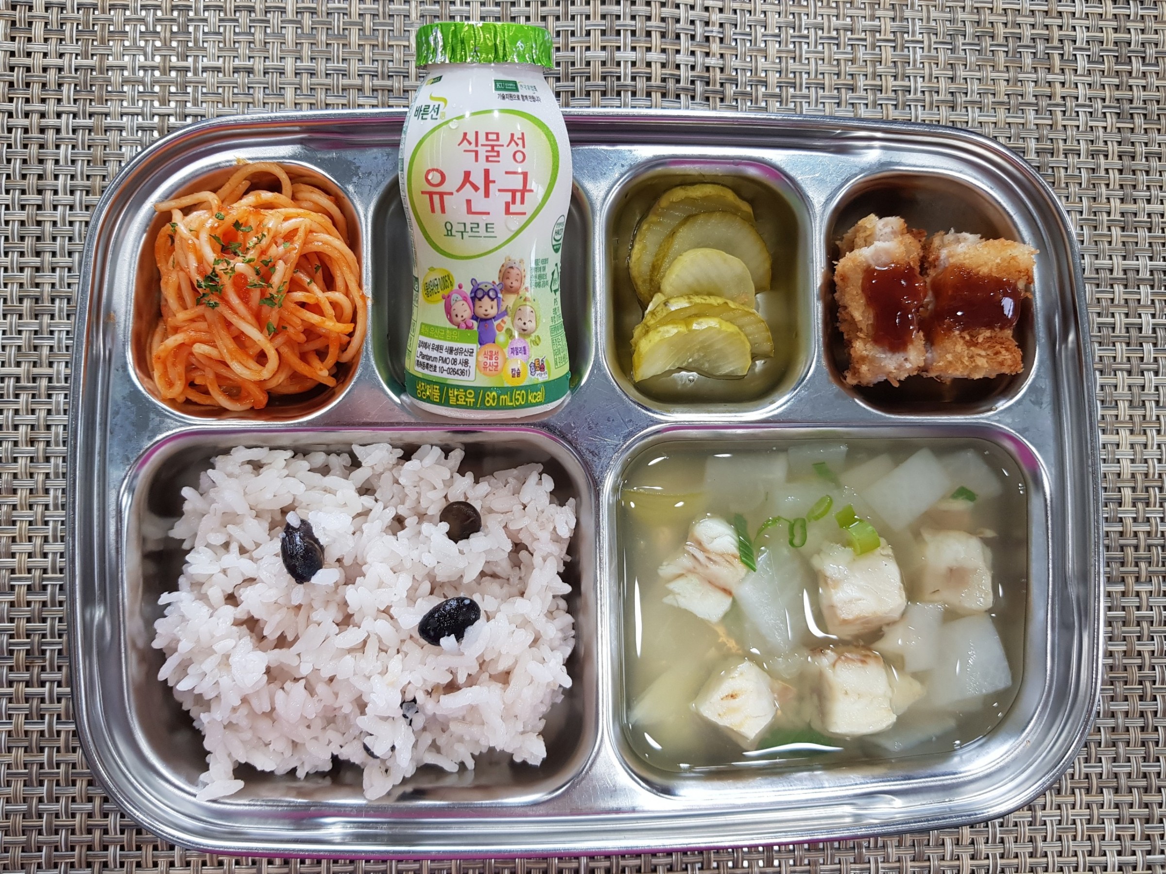 점 심 ~ 검은콩밥, 동태살무국, 순살돈까스*소스, 오이피클, 토마토파스타, 열무김치