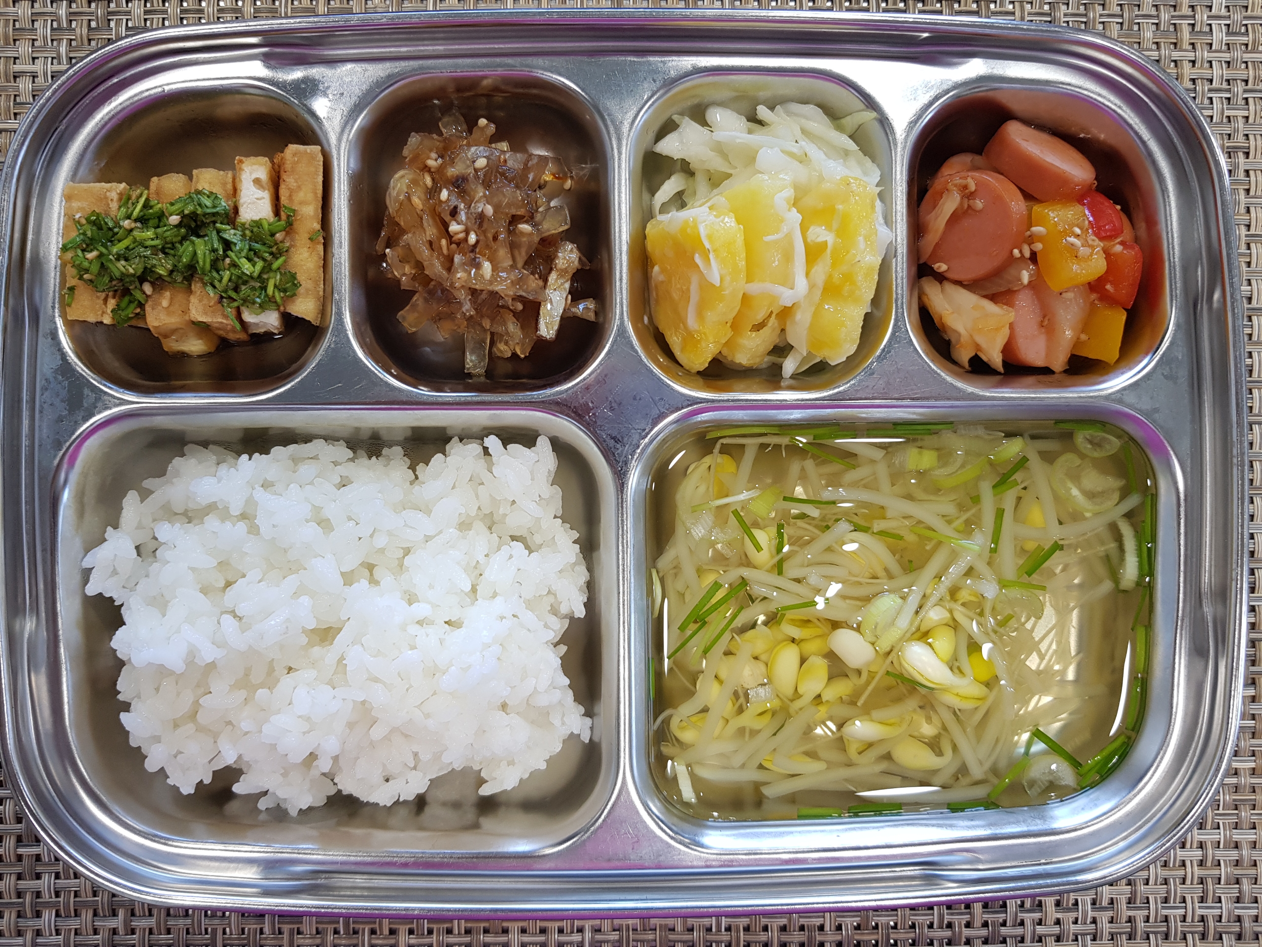 점심~ 흰쌀밥, 콩나물국, 소세지야채볶음, 두부구이*양념장, 쥐포채볶음, 파인애플양배추샐러드