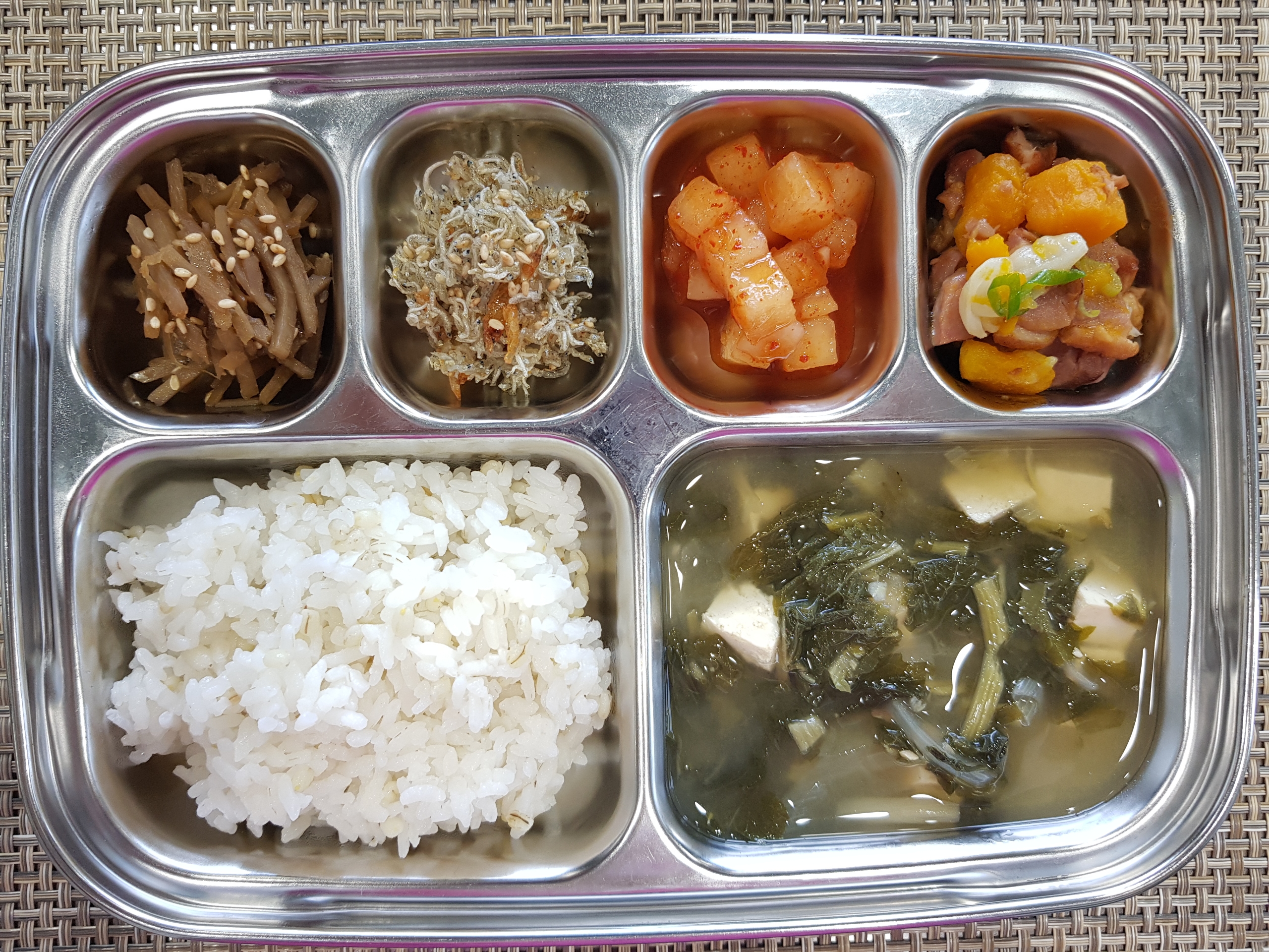 점심~ 보리밥, 시레기두부된장국, 단호박오리훈제구이, 우엉채조림, 잔멸치볶음, 홍시깍두기