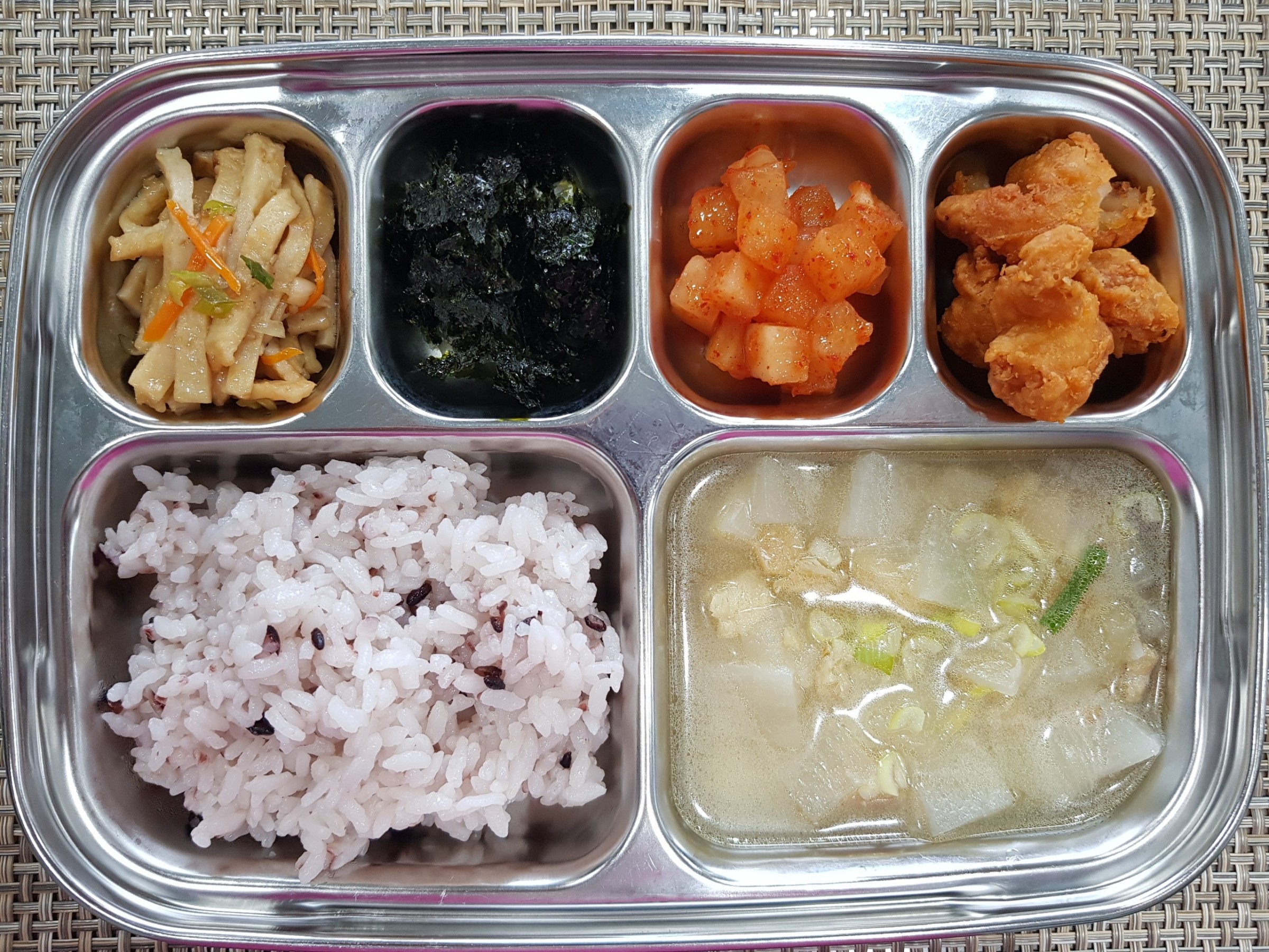 점 심 ~ 흑미밥, 북어국, 후라이드치킨, 어묵야채볶음, 조미김, 홍시깍두기
