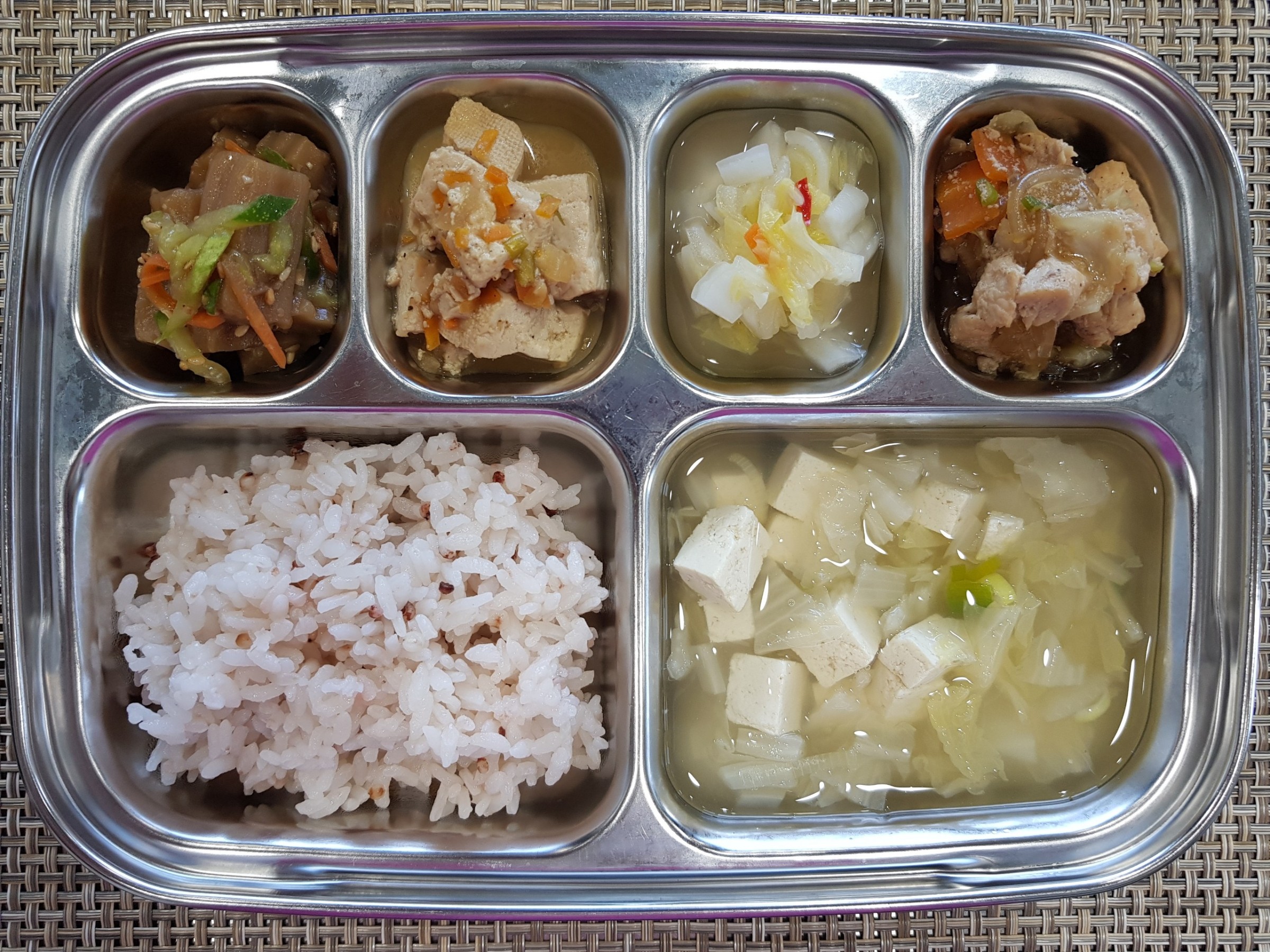 점 심 ~ 수수밥, 안매운김치두부국, 안동찜닭, 두부조림, 도토리묵야채무침, 백김치