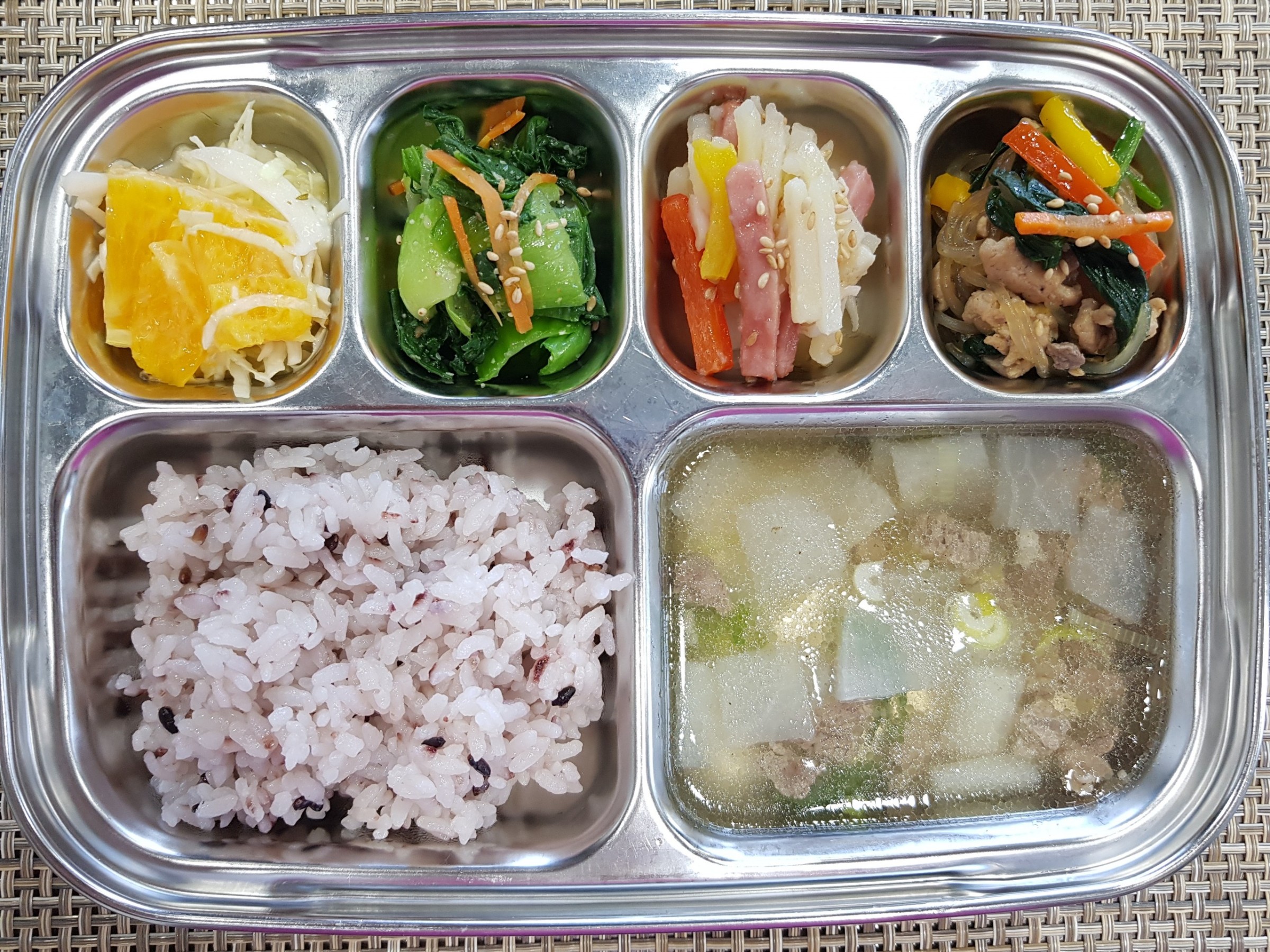 점 심 ~ 흑미밥, 소고기무국, 궁중잡채, 햄감자채볶음, 청경채나물, 오렌지양배추샐러드