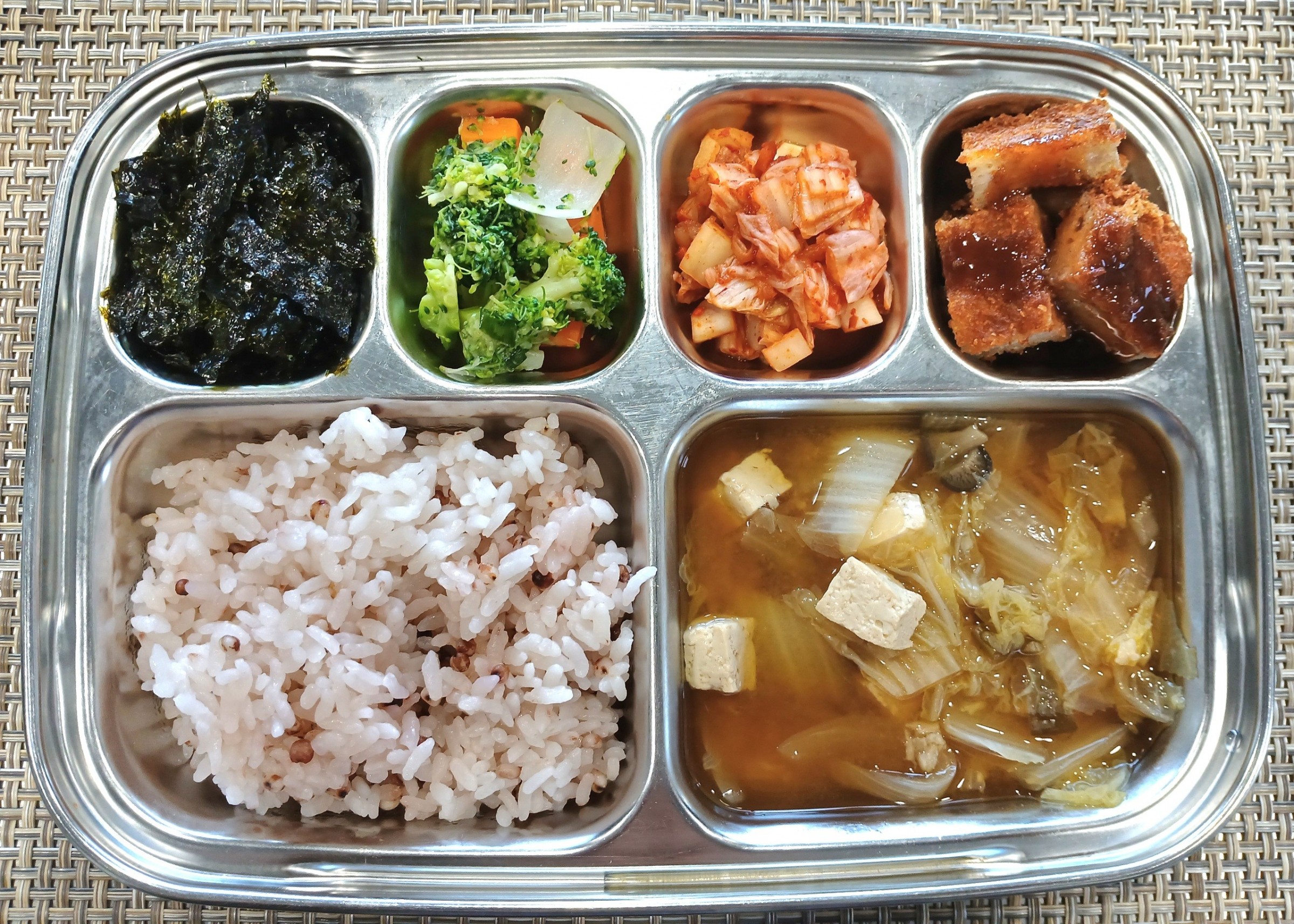 점 심 ~ 찰수수밥, 배추두부된장국, 순살돈까스*소스, 브로콜리무침, 조미김, 배추김치
