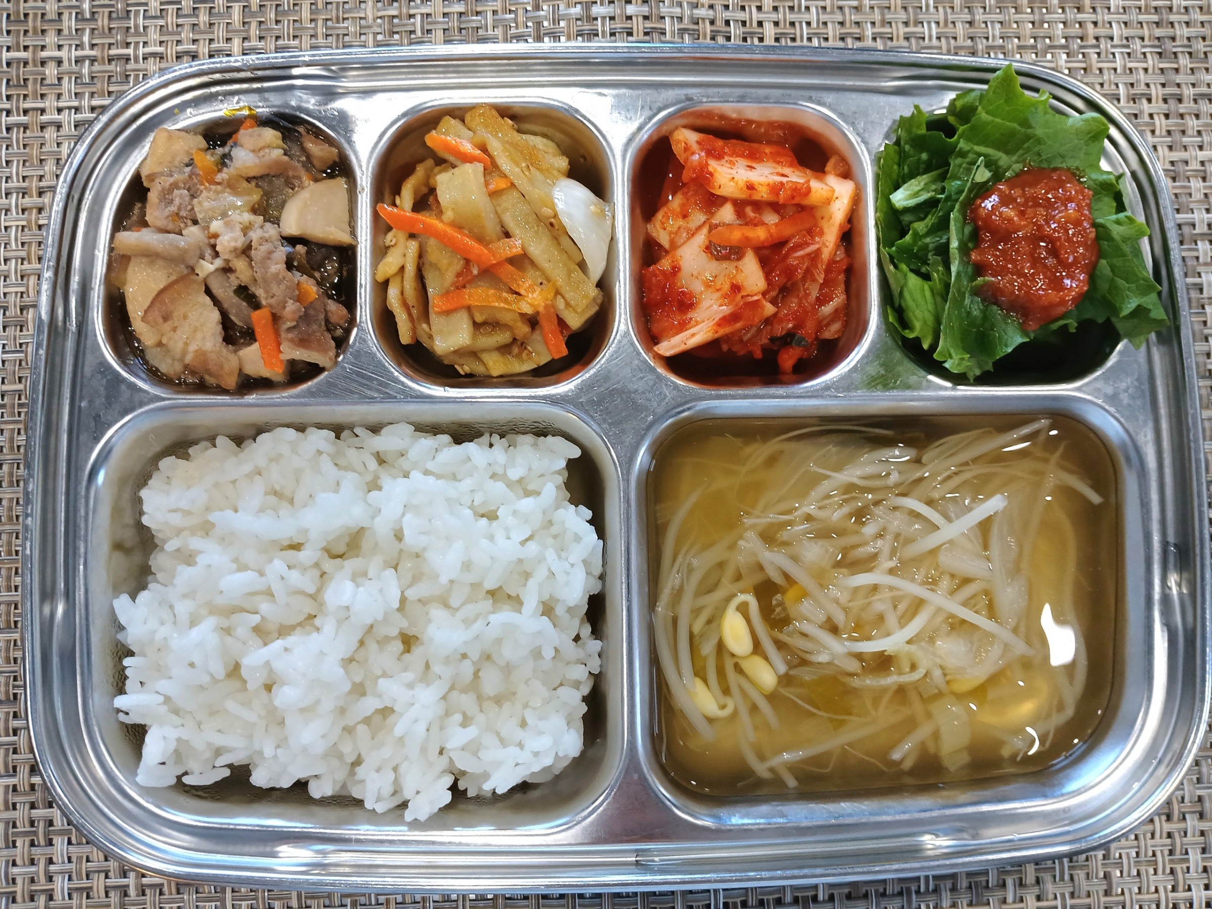점 심 ~ 흰쌀밥, 콩나물국, 돈육두루치기, 청상추*쌈장, 어묵야채볶음, 배추김치