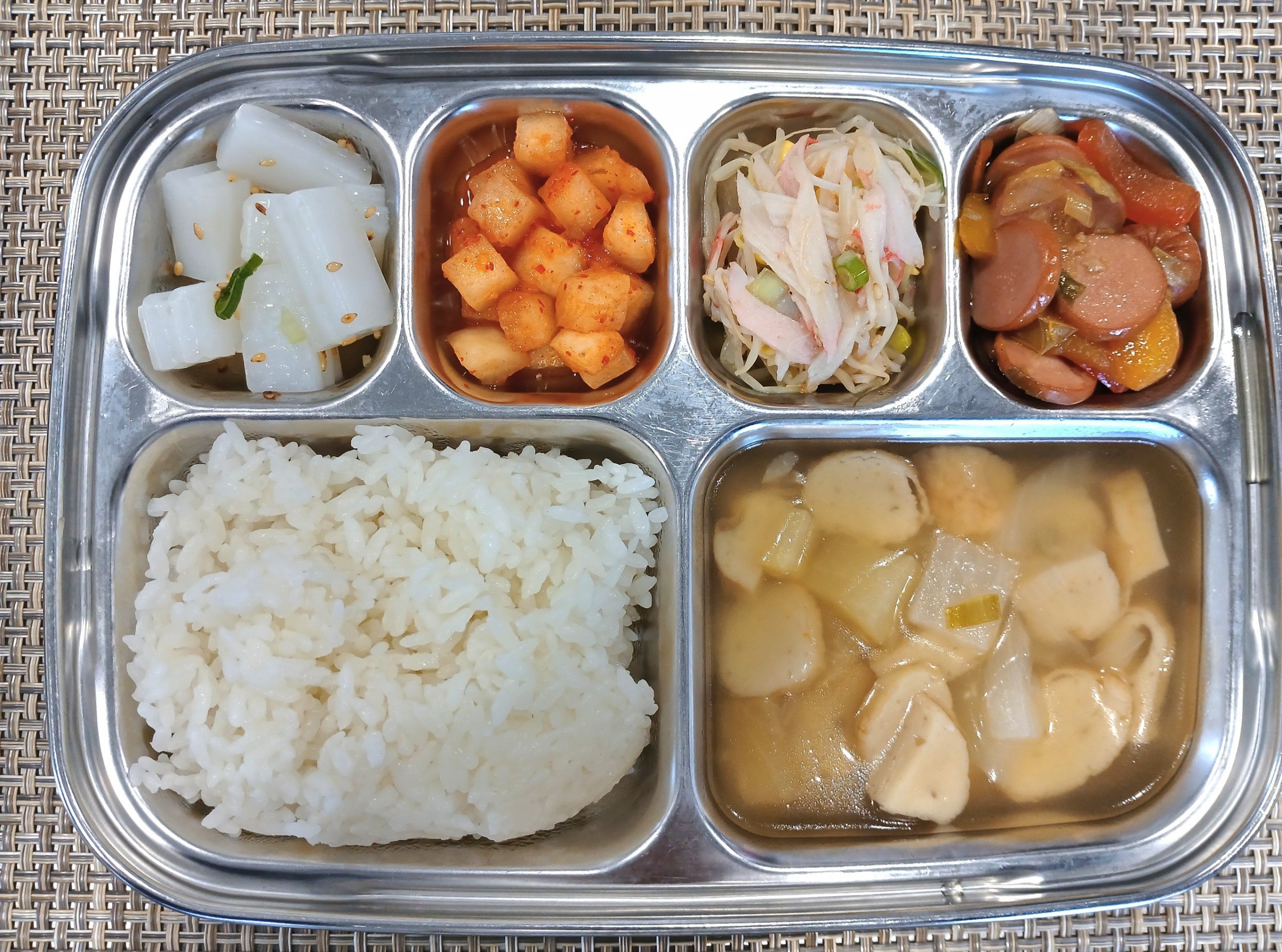 점 심 ~ 흰쌀밥, 모듬어묵탕, 소세지야채볶음, 크래미콩나물무침, 청포묵무침, 홍시깍두기