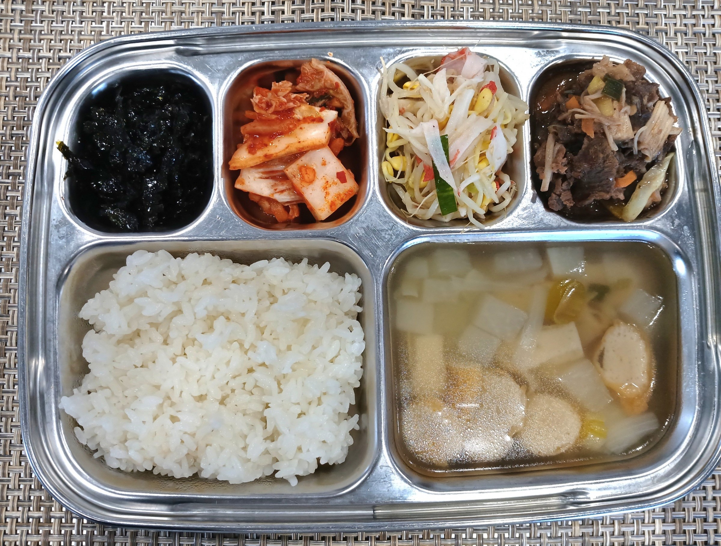점 심 ~ 찹쌀밥, 어묵국, 팽이버섯소불고기, 크래미콩나물무침, 조미김, 배추김치