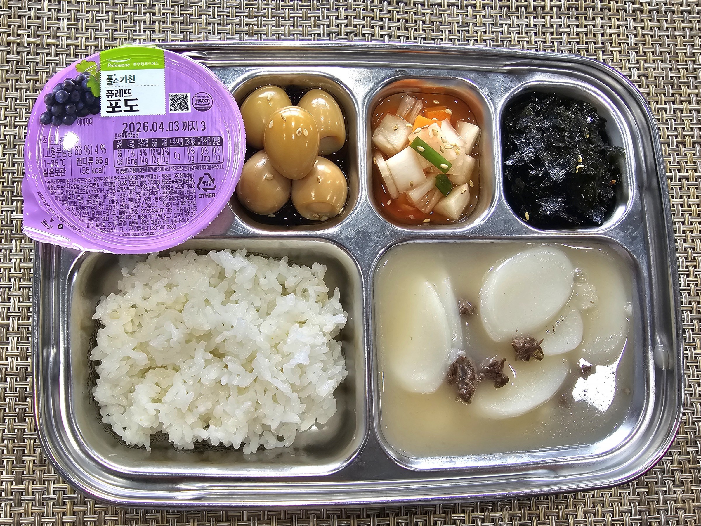 점 심 ~ 흰쌀밥, 소고기사골떡국, 메추리알장조림, 조미김, 푸딩(포도맛), 나박김치