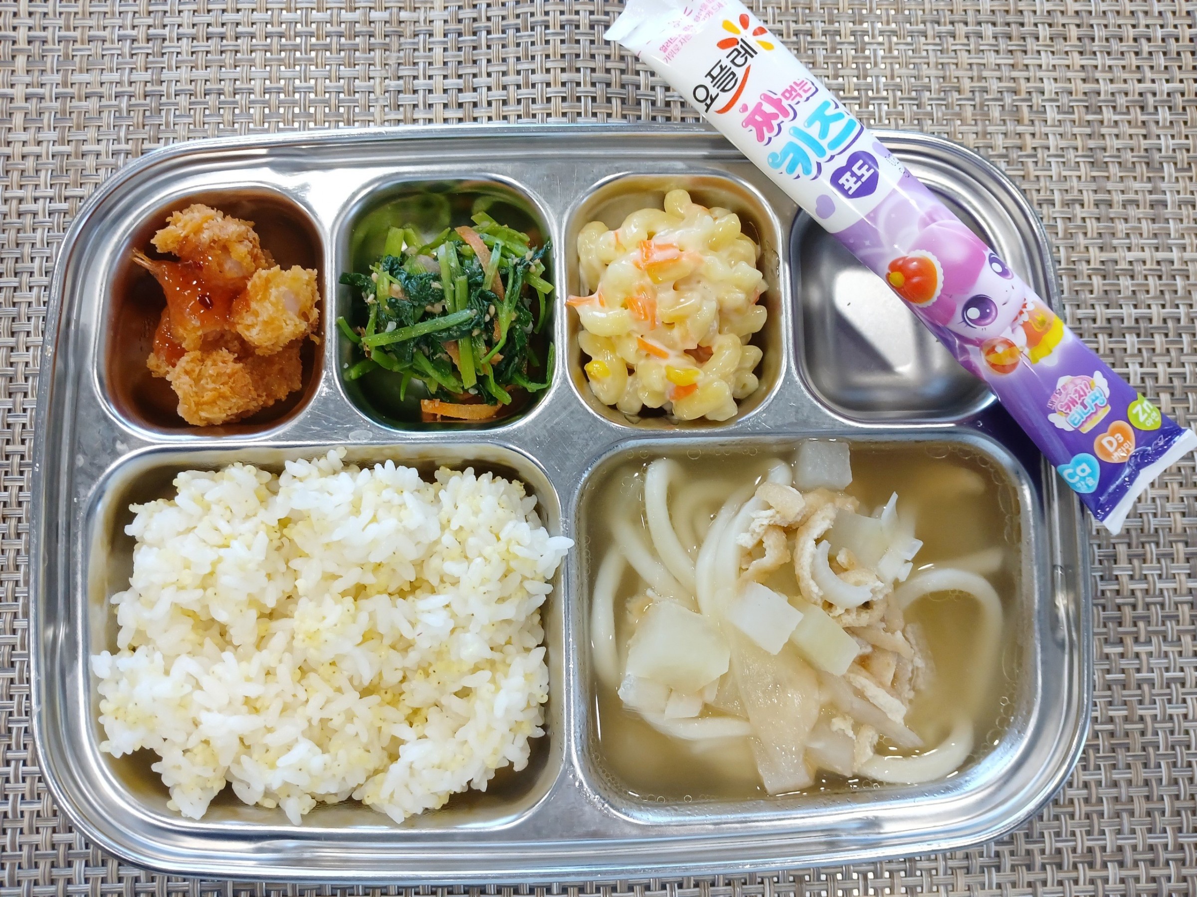 점 심 ~ 기장밥, 유부우동, 왕새우튀김*스위트칠리소스, 참나물무침, 짜요짜요(포도), 마카로니콘샐러드