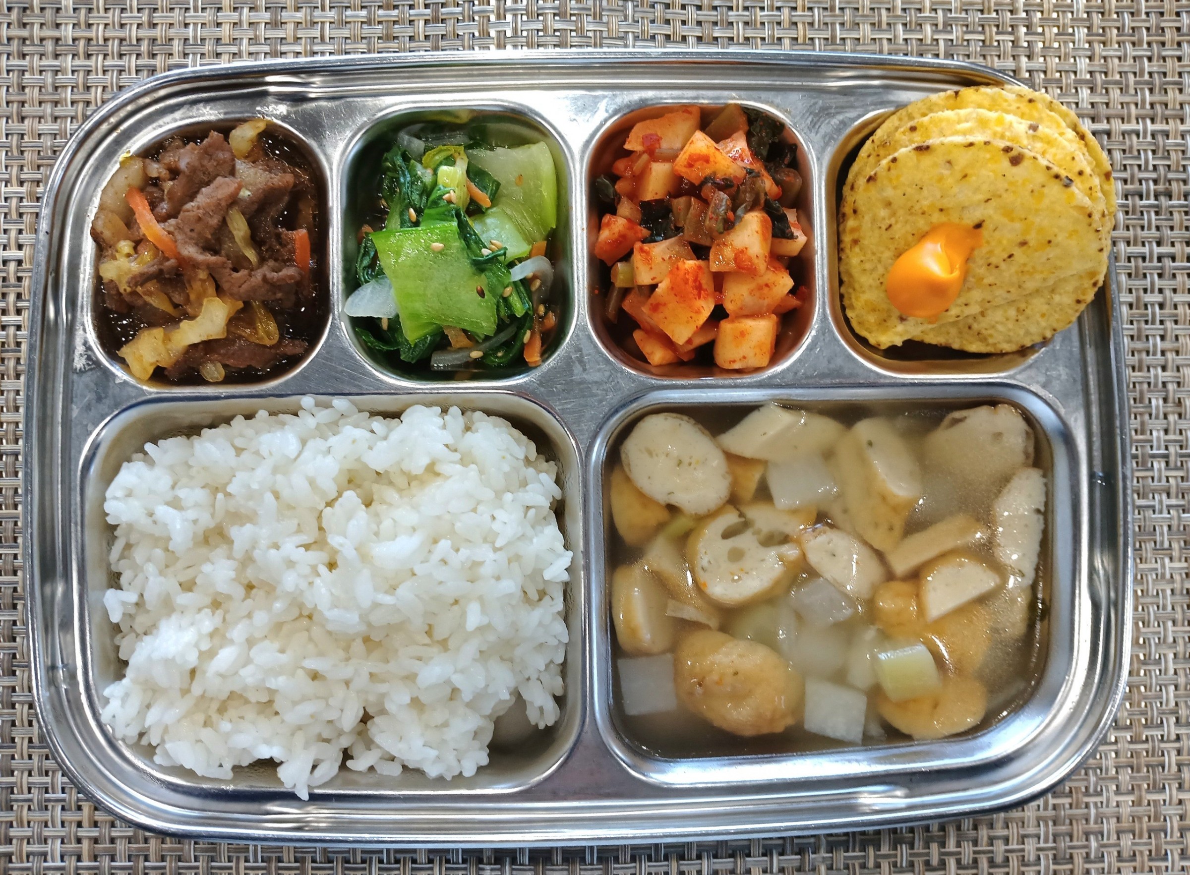 점 심 ~ 흰쌀밥, 모듬어묵탕, 돈육야채불고기, 나쵸*치즈, 청경채나물, 총각김치