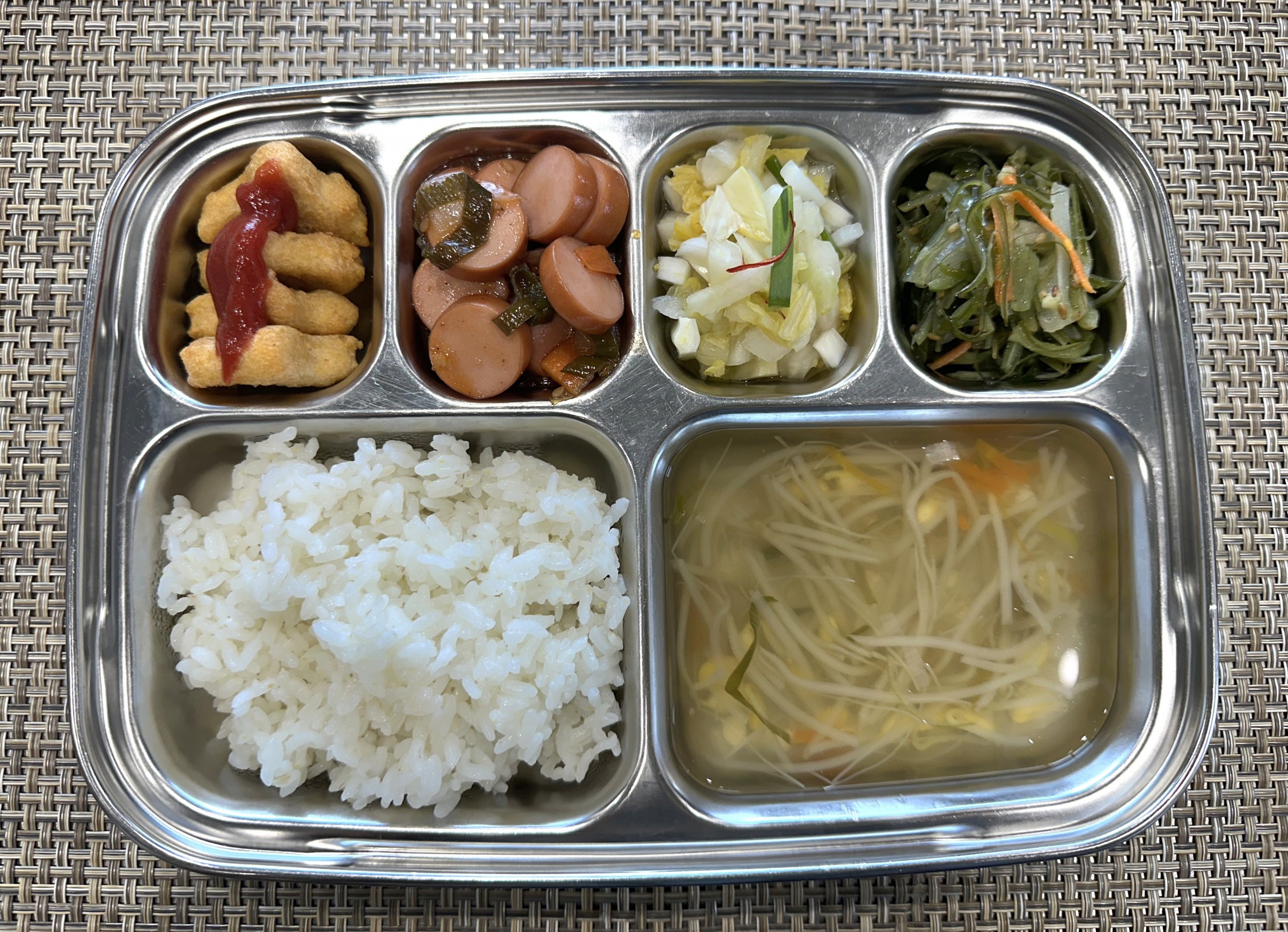 점 심 ~ 흰쌀밥, 콩나물국, 치킨너겟, 소세지야채볶음, 미역줄기볶음, 백김치