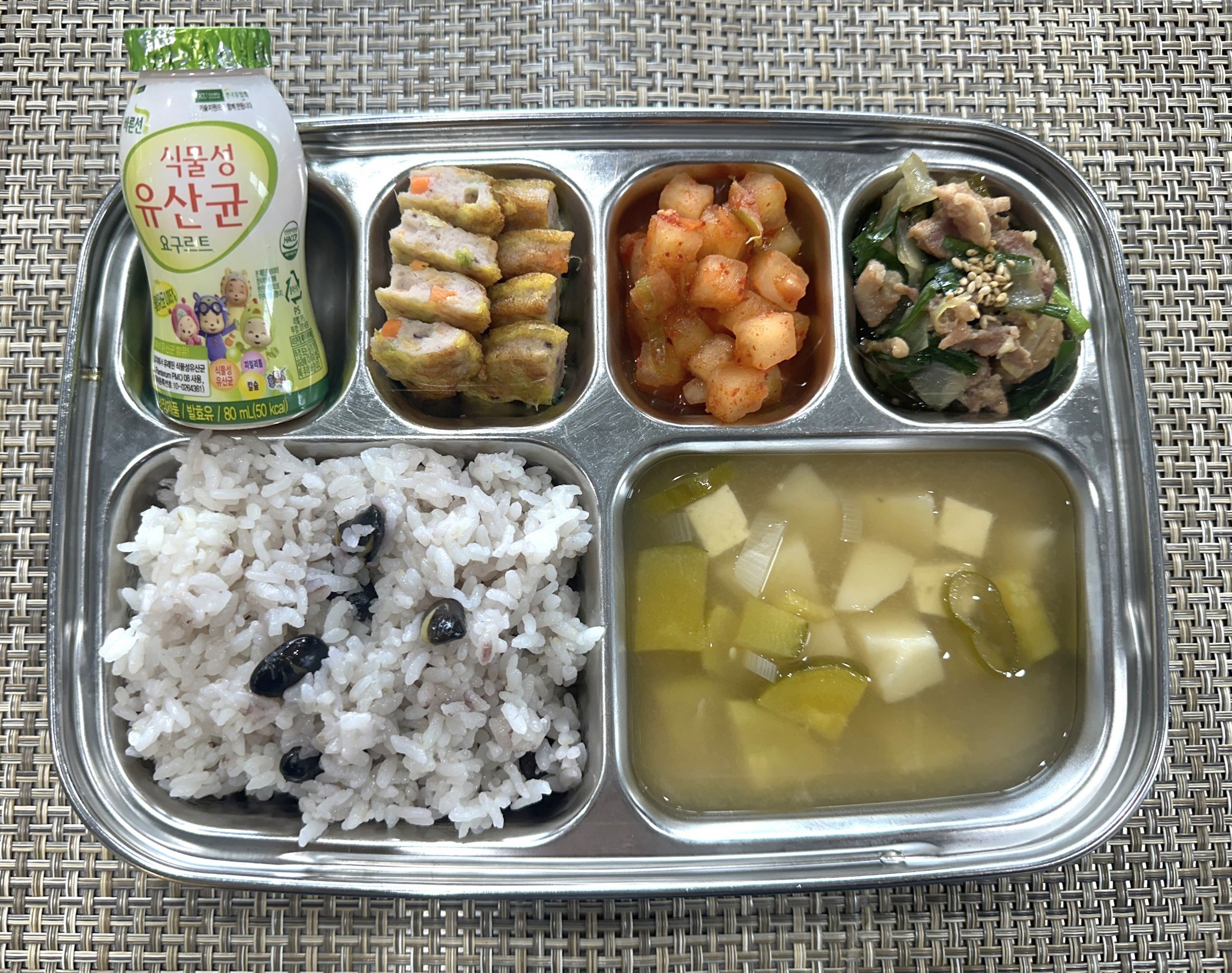 점 심~ 서리태콩밥, 애호박두부된장국, 부추오리불고기, 해물동그랑땡, 요구르트, 홍시깍두기