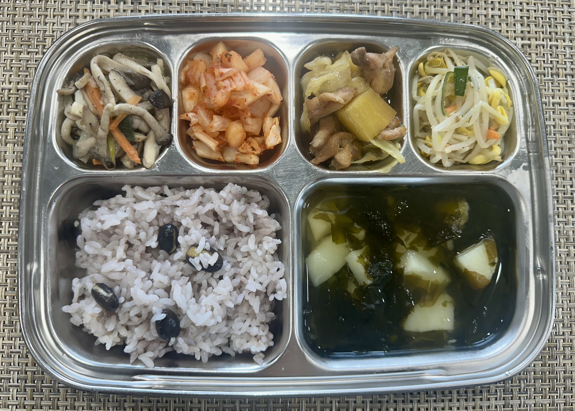 점심 ~ 검은콩밥, 감자미역국, 고구마야채닭갈비, 콩나물무침, 모듬버섯볶음, 배추김치