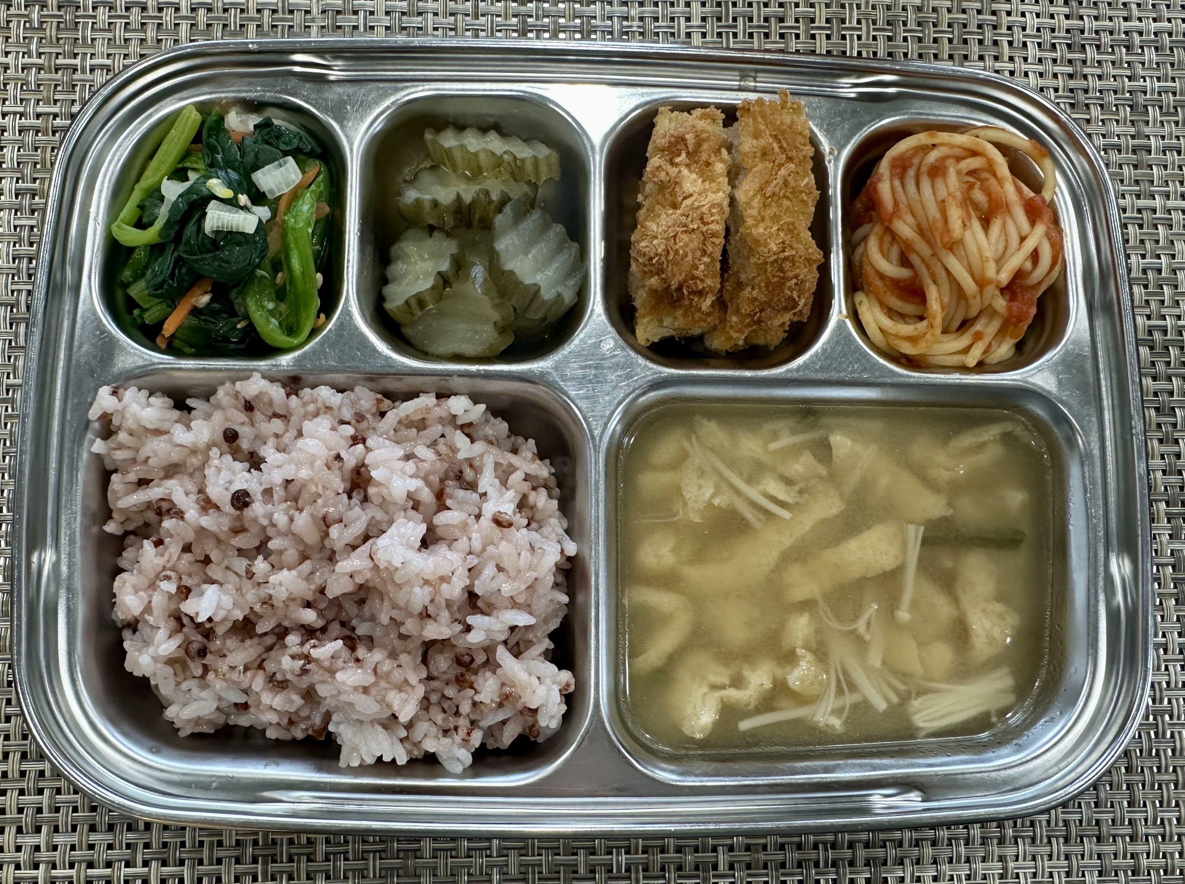 점심 ~ 기장밥, 유부장국, 순살돈까스/소스, 토마토스파게티, 시금치나물, 오이피클