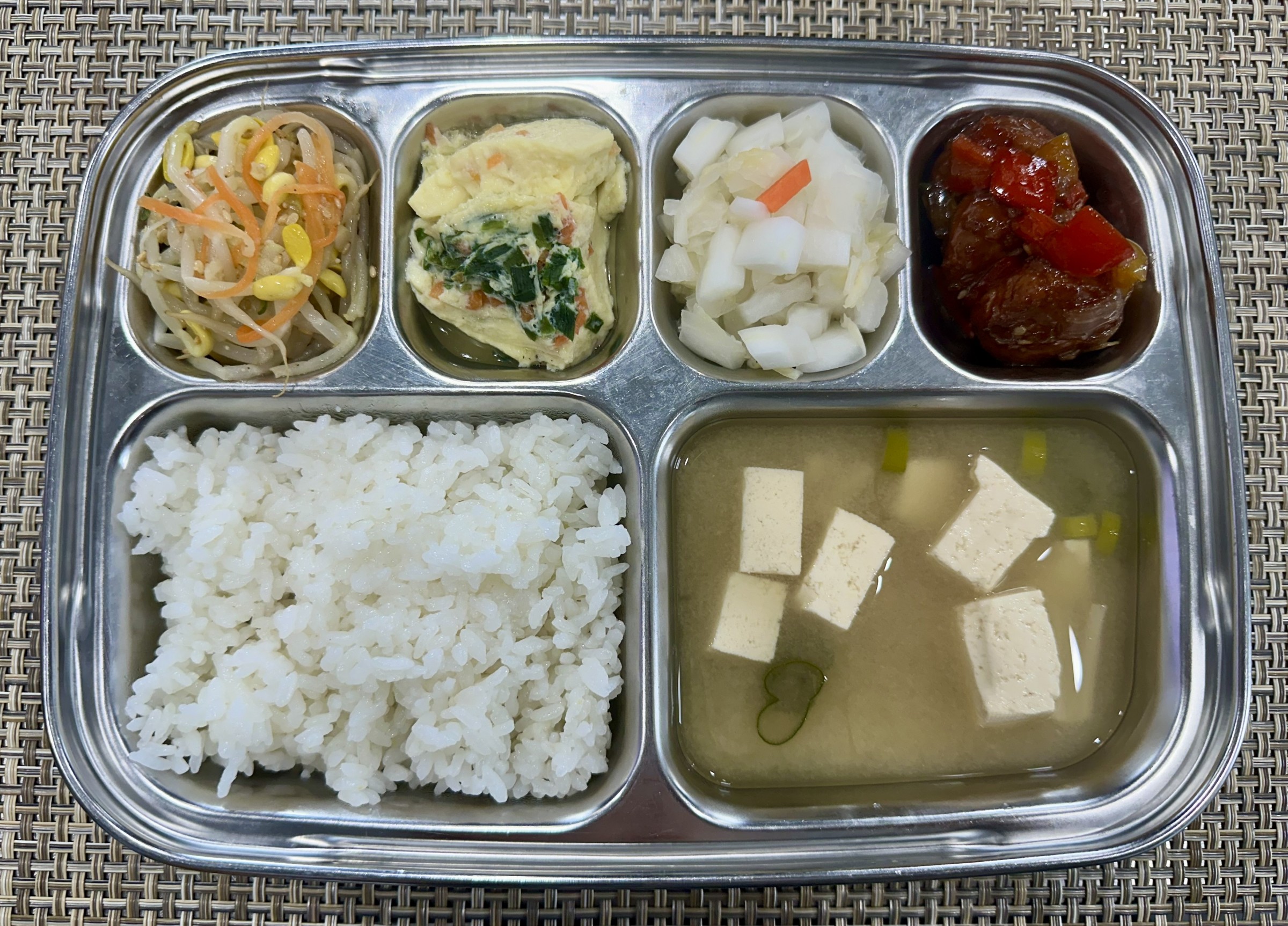 점심 ~ 소고기짜장밥, 두부미소국, 파프리카미트볼조림, 콩나물무침, 영양계란찜, 백김치